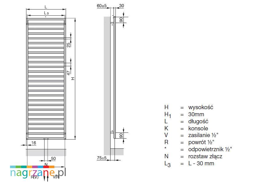 - montaż: grzejnik do montażu naściennego, w zestawie konsole mocujące (zestaw montażowy w kolorze grzejnika)