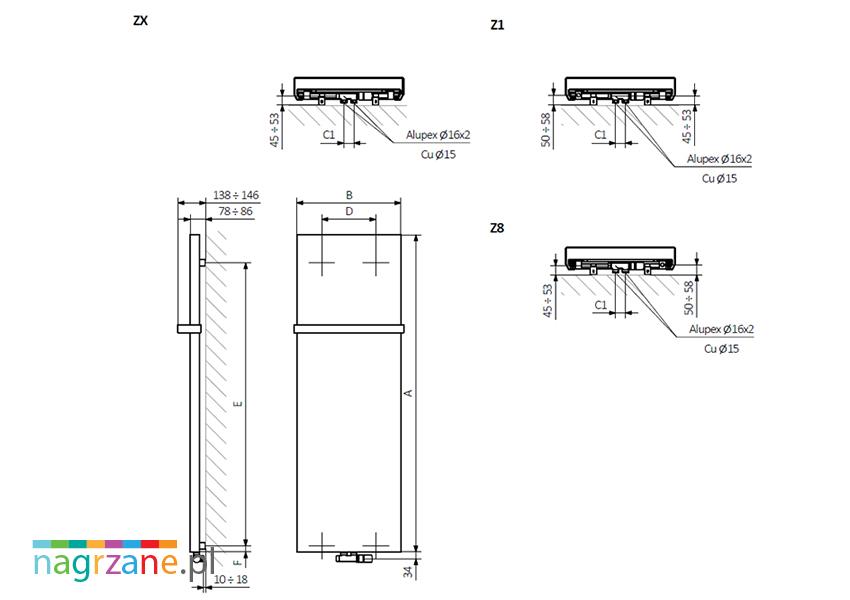 Standardowym przyłączem w grzejniku Case jest podłączenie dolne środkowe o rozstawie 50 mm (ZX), możliwe jest również podłączenie grzałki po lewej (Z1) lub po prawej (Z8) stronie grzejnika.