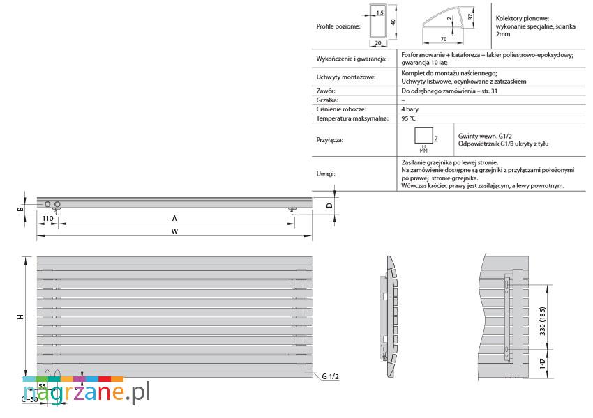 W zestawie z grzejnikiem dostarczany jest zestaw do montażu naściennego – uchwyty w formie listew, ocynkowane z zatrzaskami.