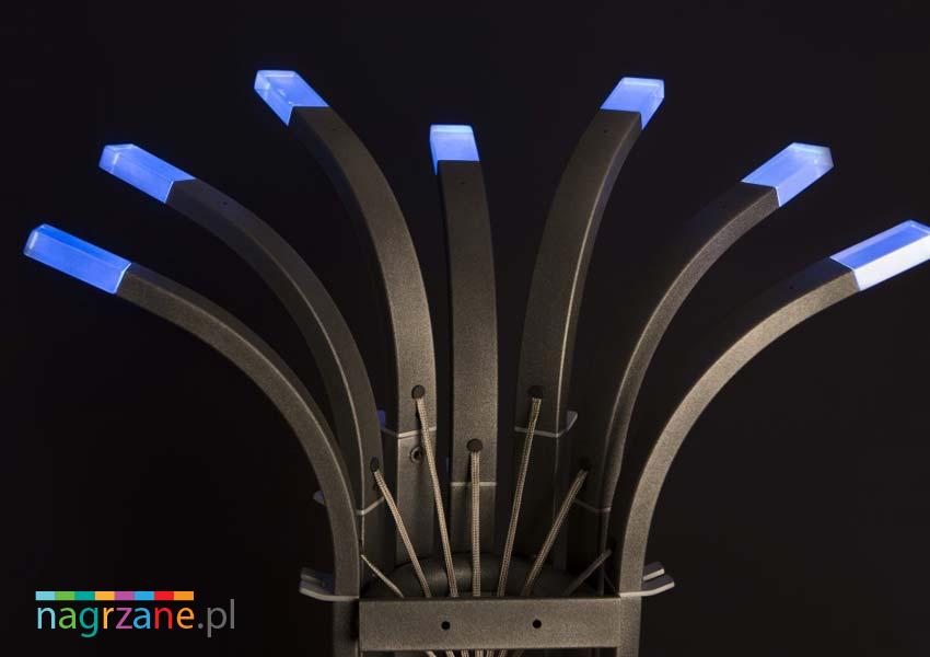 Końcówki pionowych profili wyposażone są we wbudowane lampki (LED) o mocy 3W – trwałość oświetlenia 20 000 godzin, napięcie 230 V, kąt rozsyłu 120°.