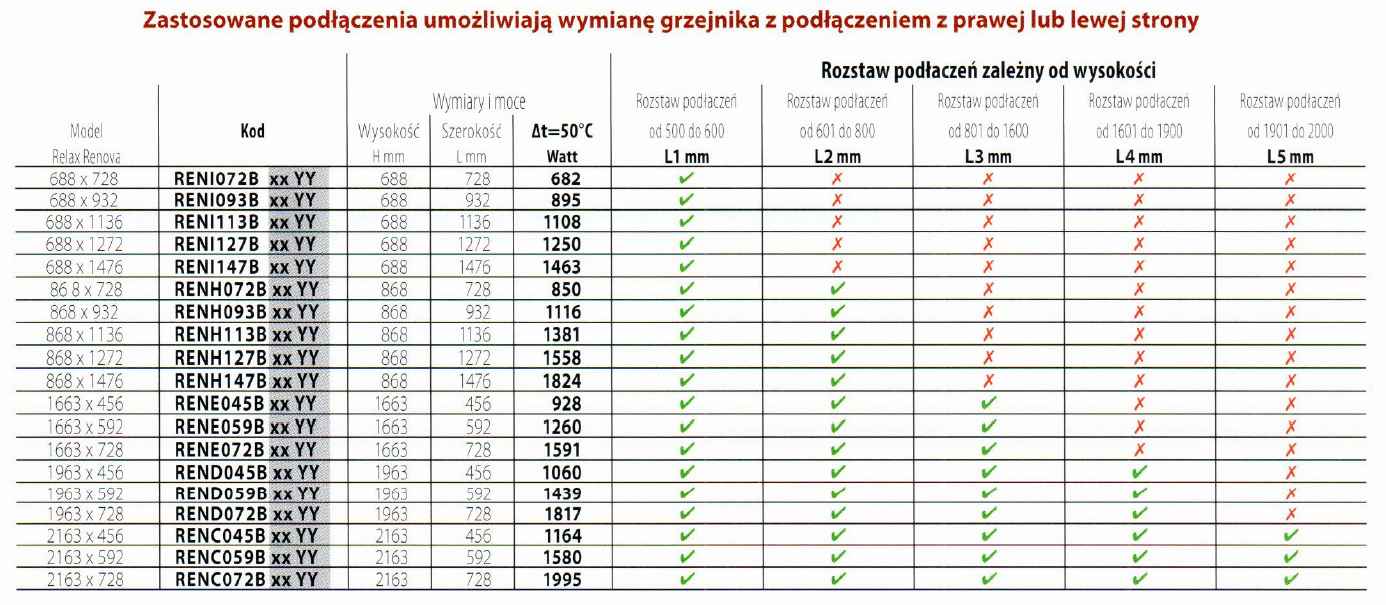 Relax Renova składa się z płyty grzewczej, maksymalna temperatura jego pracy wynosi 95 stopni Celsjusza, zaś dopuszczalne ciśnienie robocze - 4 bary. Na życzenie dostępna jest również głowica termostatyczna. Model produkowany jest w ogromnej liczbie rozmiarów, może być montowany w pionie lub poziome (dwie wersje grzejnika) - wersja idealna pod okienny parapet.