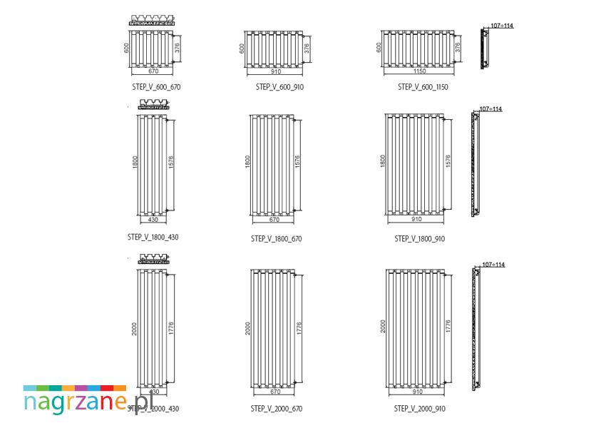 Model produkowany jest w trzech wysokościach: 600 mm, 1800 mm, 2000 mm, oraz czterech szerokościach: 670 mm, 910 mm, 1150 mm, 430 mm; głębokość każdego wariantu równa jest 107 mm. Dopuszczalne ciśnienie robocze modelu wynosi 4 bary, zaś maksymalna temperatura jego pracy - 95 stopni Celsjusza. W zestawie wraz z nim znajduje się komplet zaworów kolorystycznie dopasowanych do grzejnika, dwa ukryte zawory odpowietrzające 1/2” i osłona, cztery podłączenia do mocowania ściennego (w kolorze grzejnika).