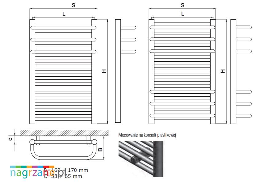 - montaż: grzejnik do montażu naściennego, w zestawie plastikowe konsole mocujące;