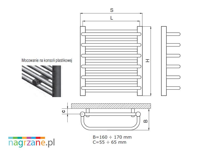 - montaż: grzejnik do montażu naściennego, w zestawie plastikowe konsole mocujące