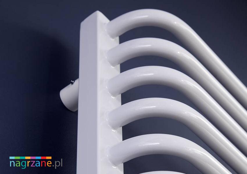 Konstrukcja polega na pionowych kolektorach o przekroju prostokąta 30 x 40 mm. Z kolei profile grzewcze są okrągłe i wygięte po bokach, przez co odpowiednio wystają. Między rzędami tych drugich rurek, użytkownik ma miejsce na odwieszenie mokrych ręczników, aby ocieplić je oraz oczywiście wysuszyć.