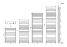 Model dostępny jest w czterech wysokościach: 725 mm, 1112 mm, 1456 mm, 1757 mm, oraz trzech szerokościach: 500 mm, 600 mm, 710 mm, przy każdej z opcji głębokość grzejnika wynosi zaledwie 83 - 98 mm.