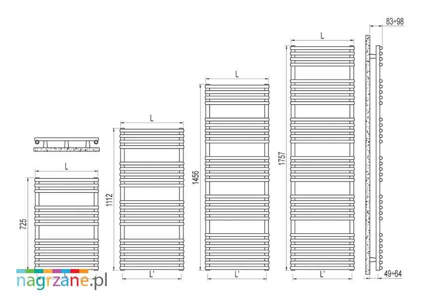 Model dostępny jest w czterech wysokościach: 725 mm, 1112 mm, 1456 mm, 1757 mm, oraz trzech szerokościach: 500 mm, 600 mm, 710 mm, przy każdej z opcji głębokość grzejnika wynosi zaledwie 83 - 98 mm.