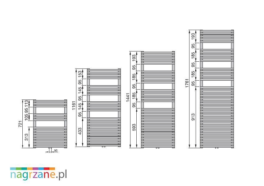- dolne o rozstawie 50 mm w środkowej części grzejnika