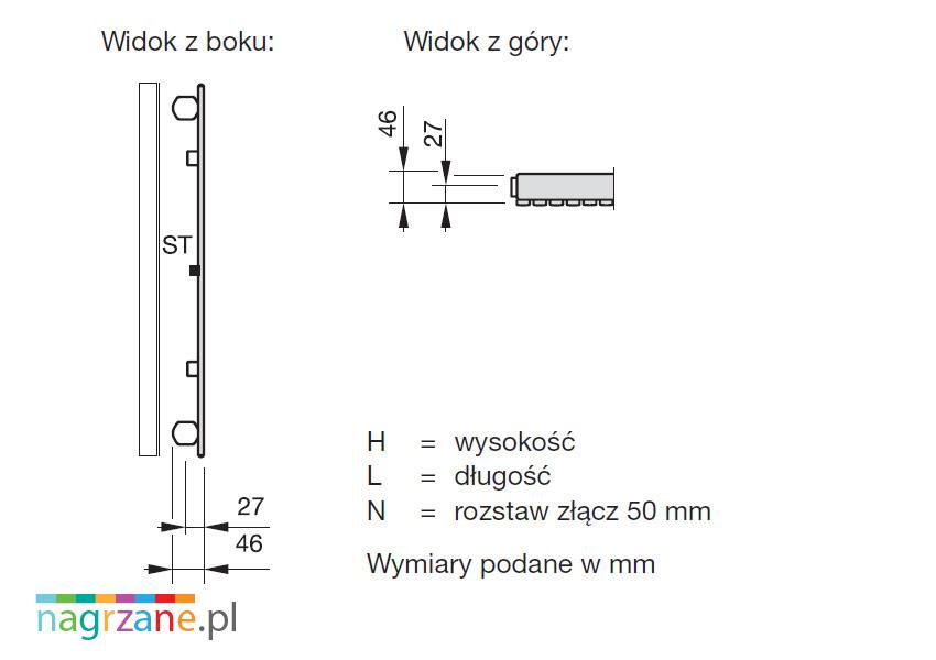 - dolne o rozstawie 50 mm w środkowej części grzejnika