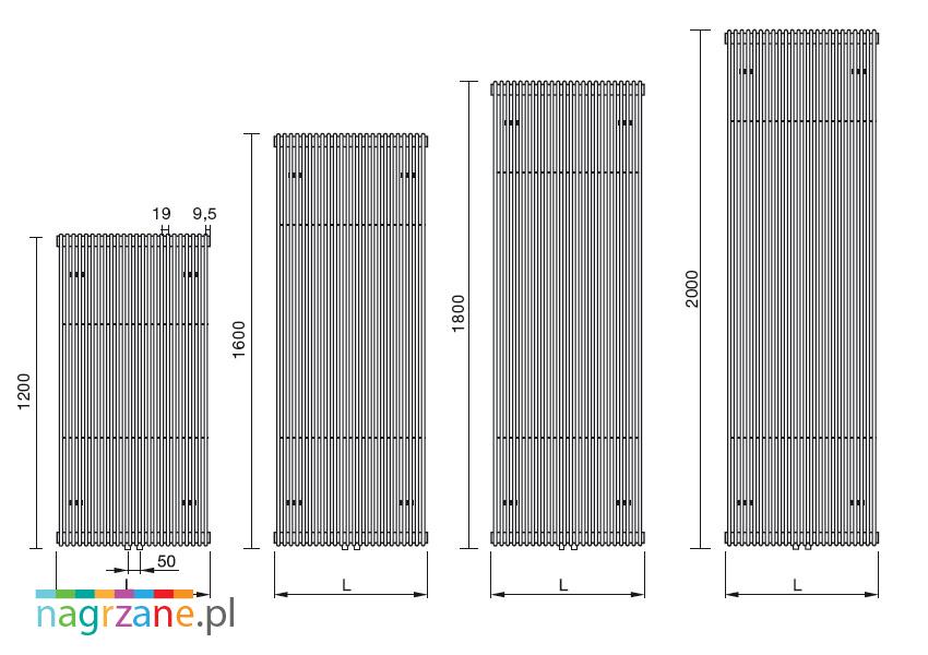 - dolne o rozstawie 50 mm w środkowej części grzejnika